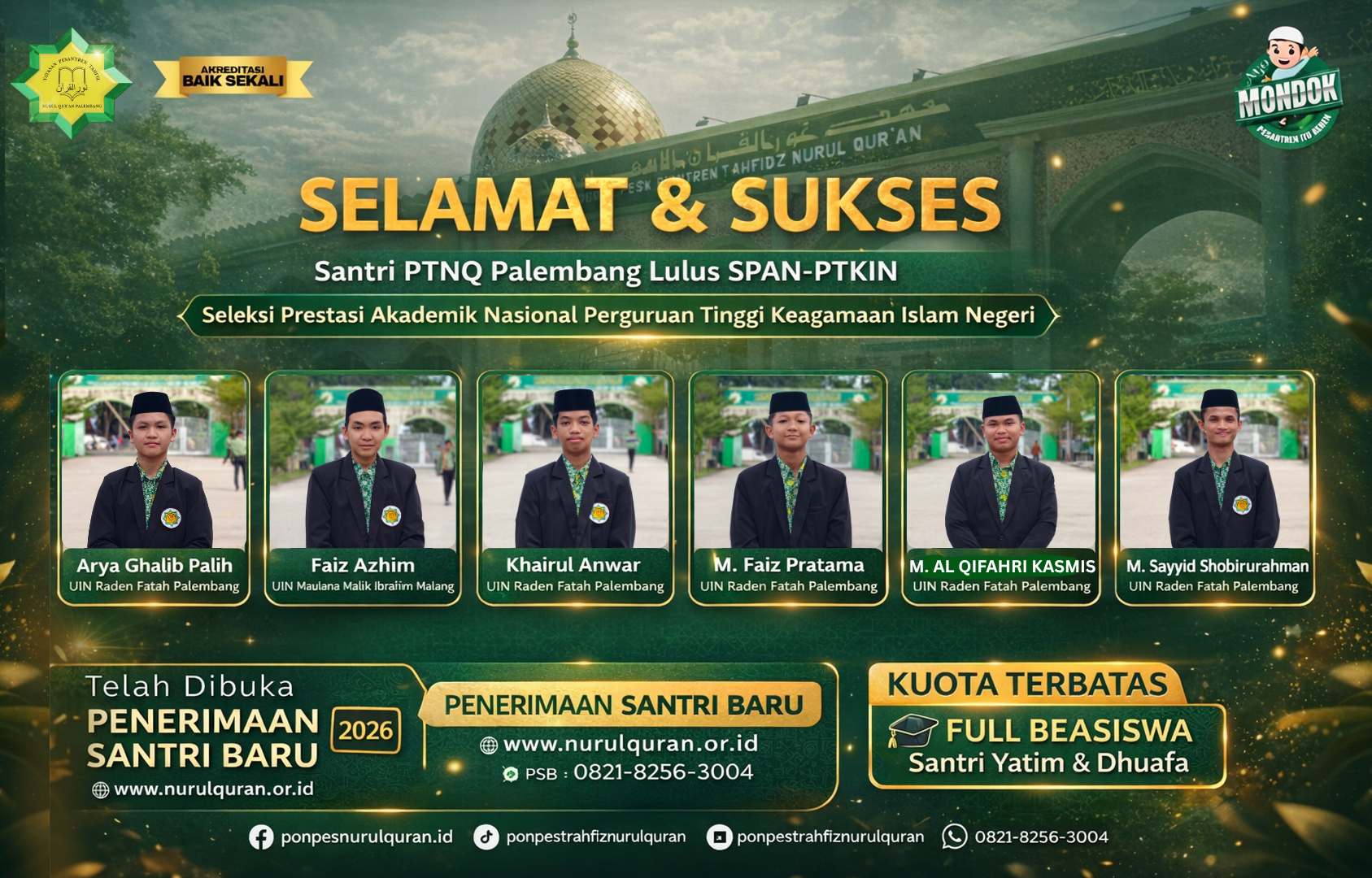 Palembang — Kabar membanggakan kembali datang dari Pondok Pesantren Tahfidz Nurul Qur’an Palembang. Sebanyak delapan santri terbaik berhasil diterima di perguruan tinggi negeri melalui jalur SPAN-PTKIN (Seleksi Prestasi Akademik Nasional Perguruan Tinggi Keagamaan Islam Negeri) pada tahun 2026. Seluruh santri tersebut dinyatakan lulus dan diterima di UIN Raden Fatah Palembang,